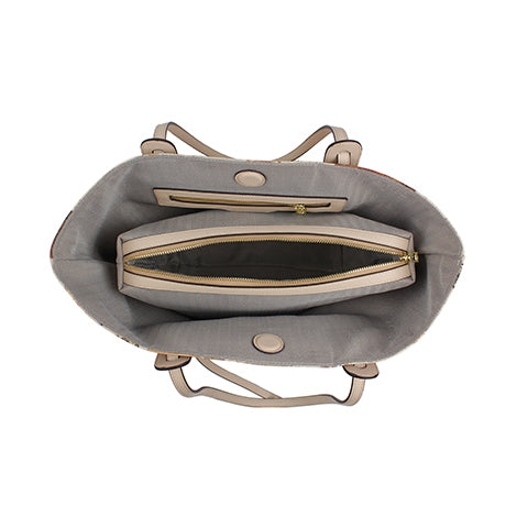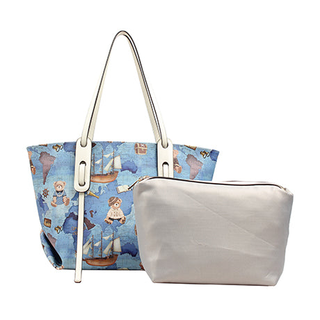 Make a statement with the whimsical charm and practical elegance of the Como Shoulder Bag with Pouch. Crafted for the modern woman who loves a playful yet polished look, this tote features an adventurous map and teddy bear explorer print on a blue canvas backdrop. With ample space, durable materials, and a detachable pouch for added organization, it’s the perfect companion for daily errands, weekend getaways, or casual outings. Cream-colored leather-look straps offer a refined contrast to the lively print, bringing a balance of fun and function.