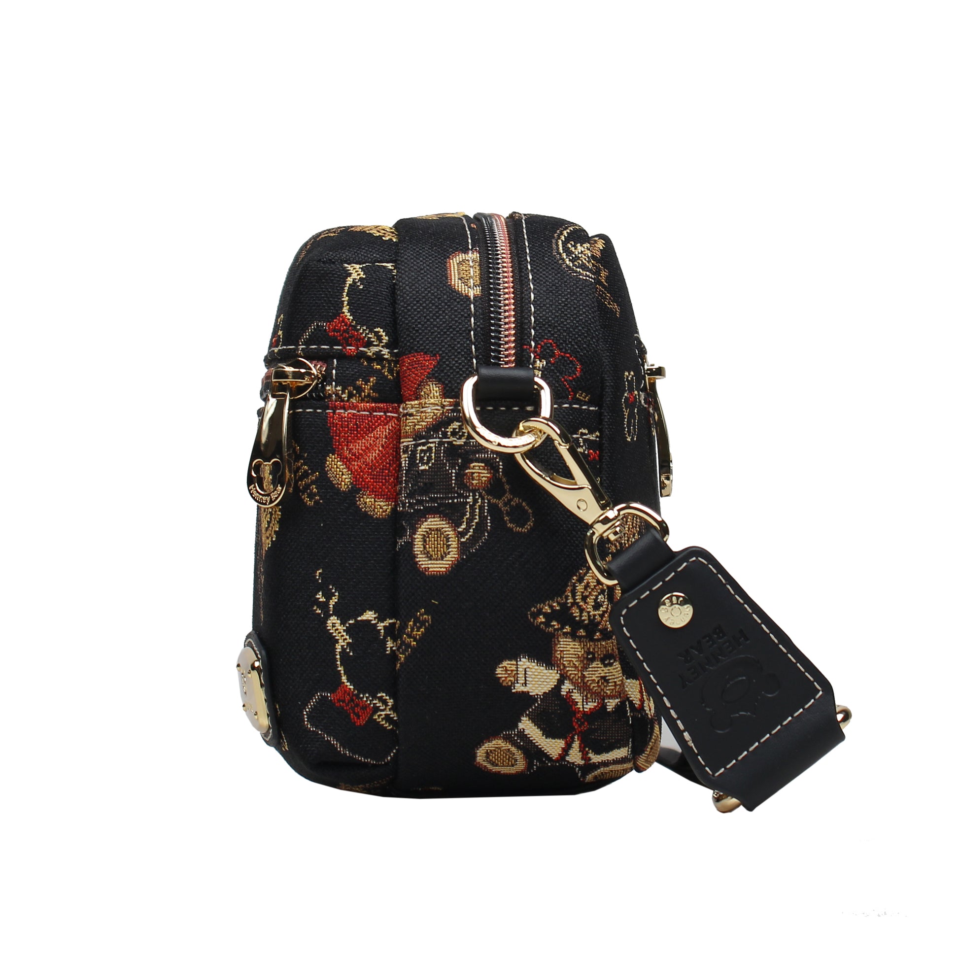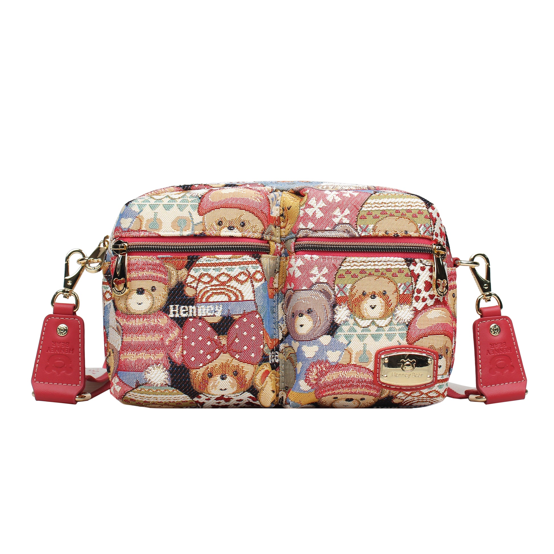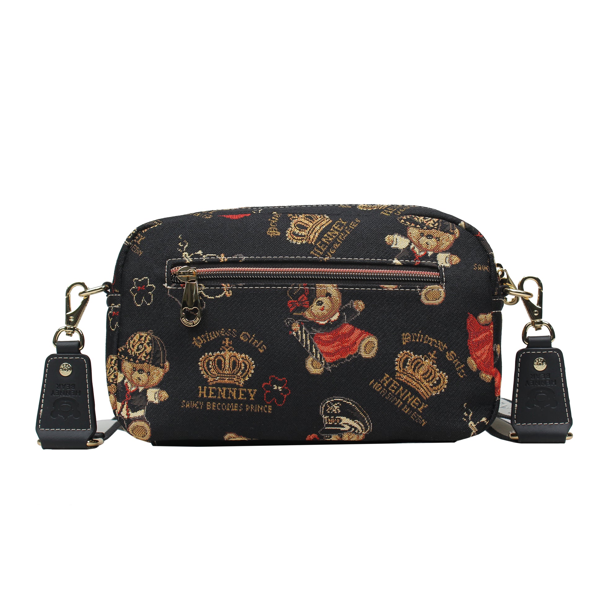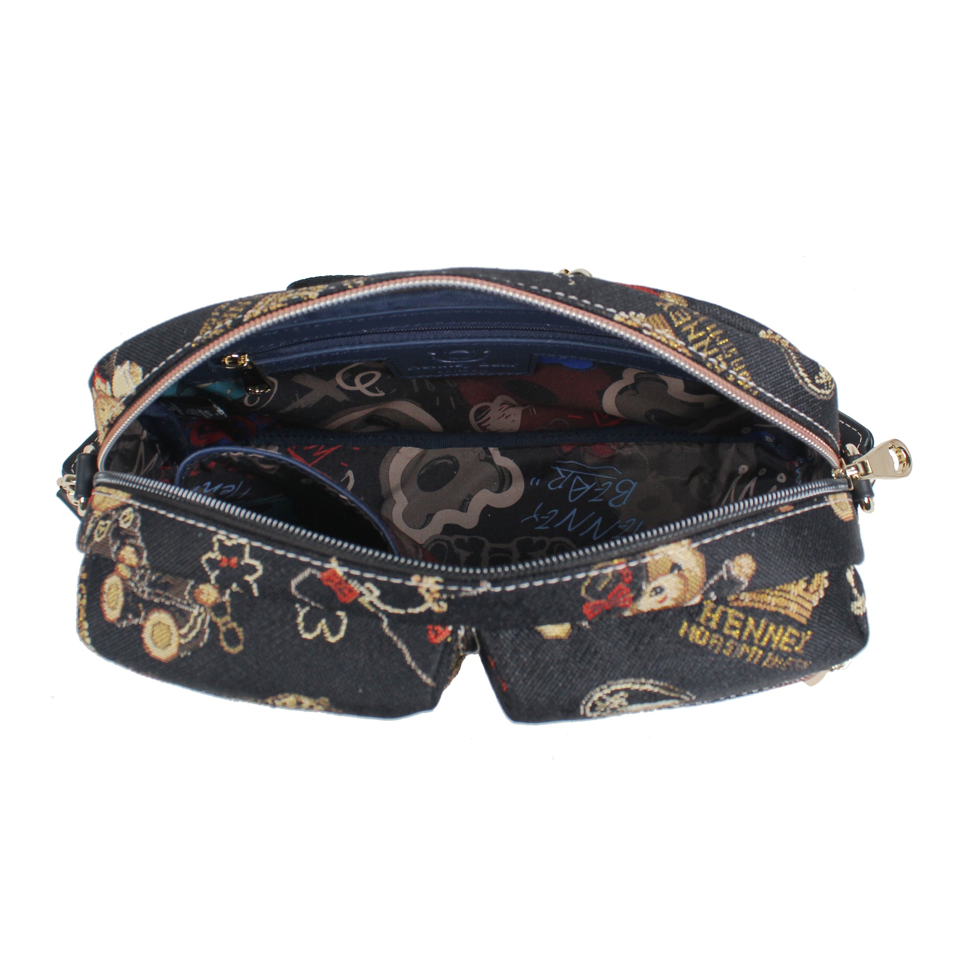 Effortless style meets everyday utility in the Henney Bear Osaka Xbody Bag. Designed with a playful all-over teddy bear print featuring bears in various outfits and poses against a rich navy background, this versatile crossbody bag is perfect for daily adventures, casual outings, or hands-free convenience. The charming pattern showcases adorable bears dressed as pilots, chefs, and other characters, creating a whimsical yet sophisticated look.