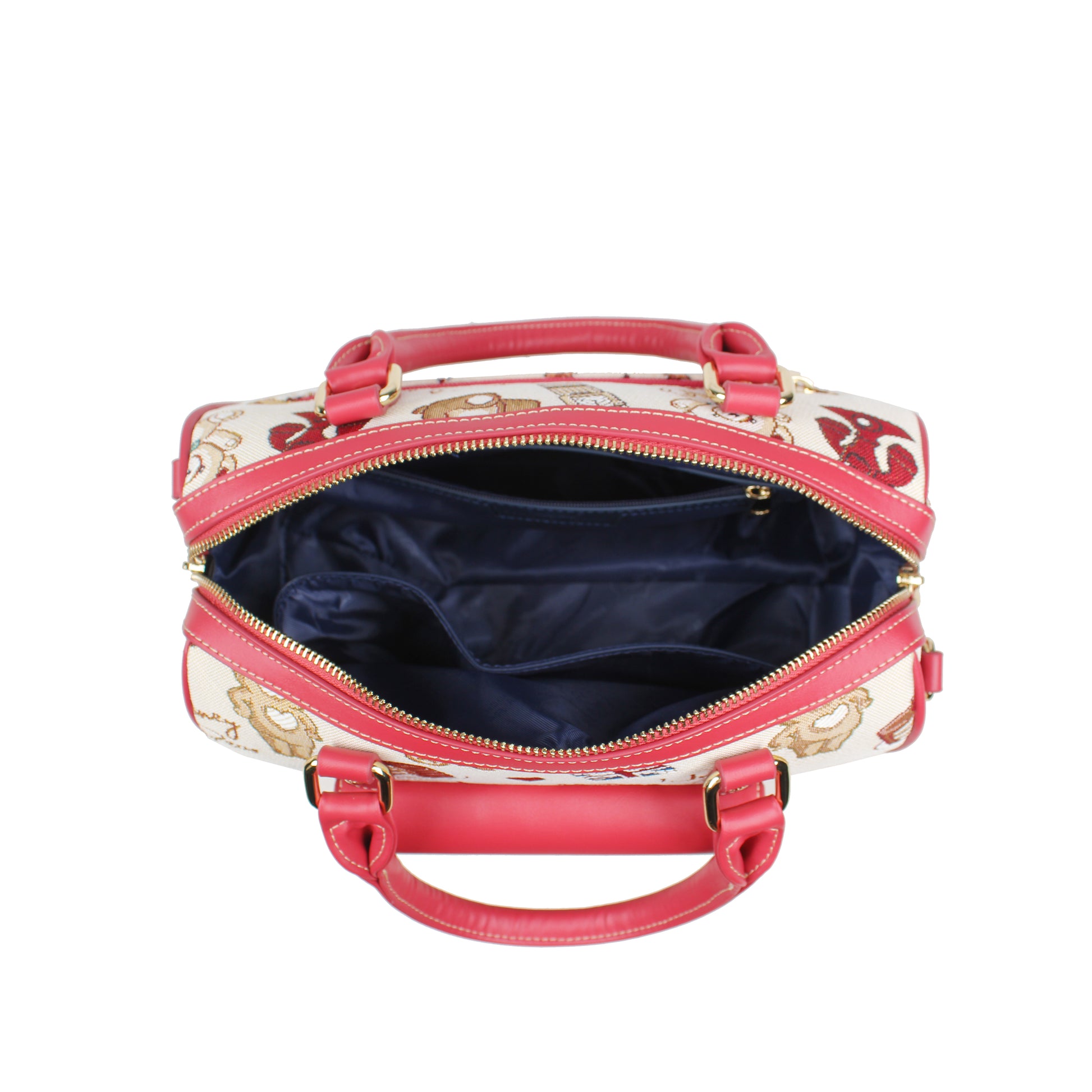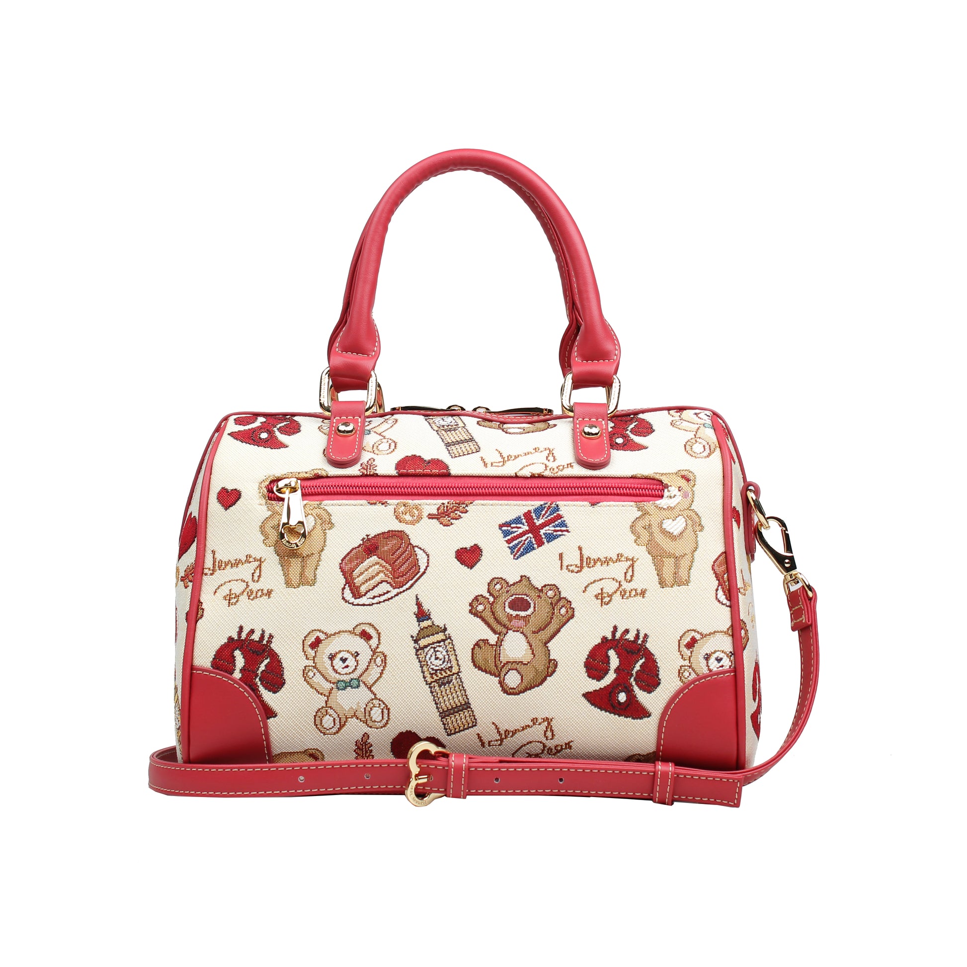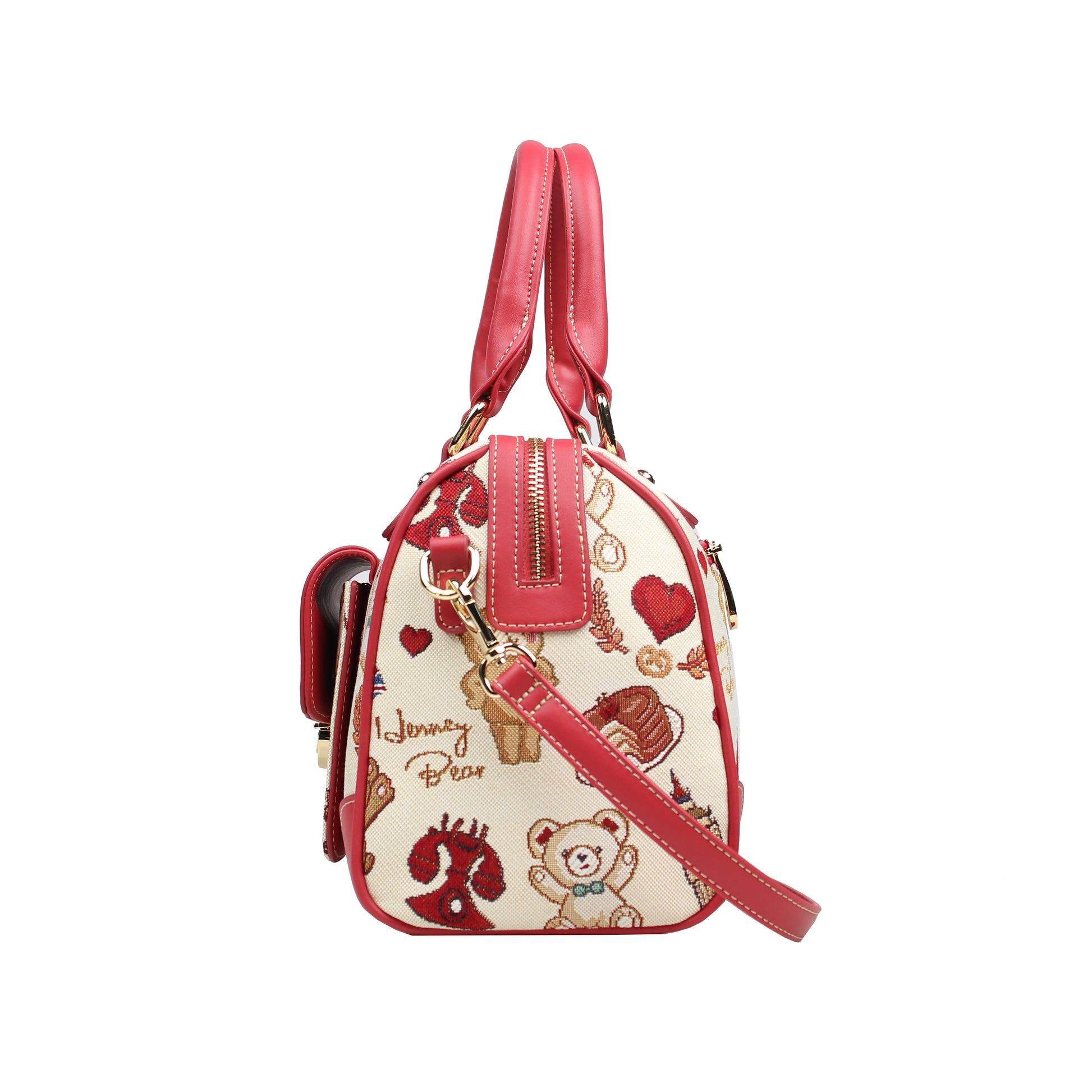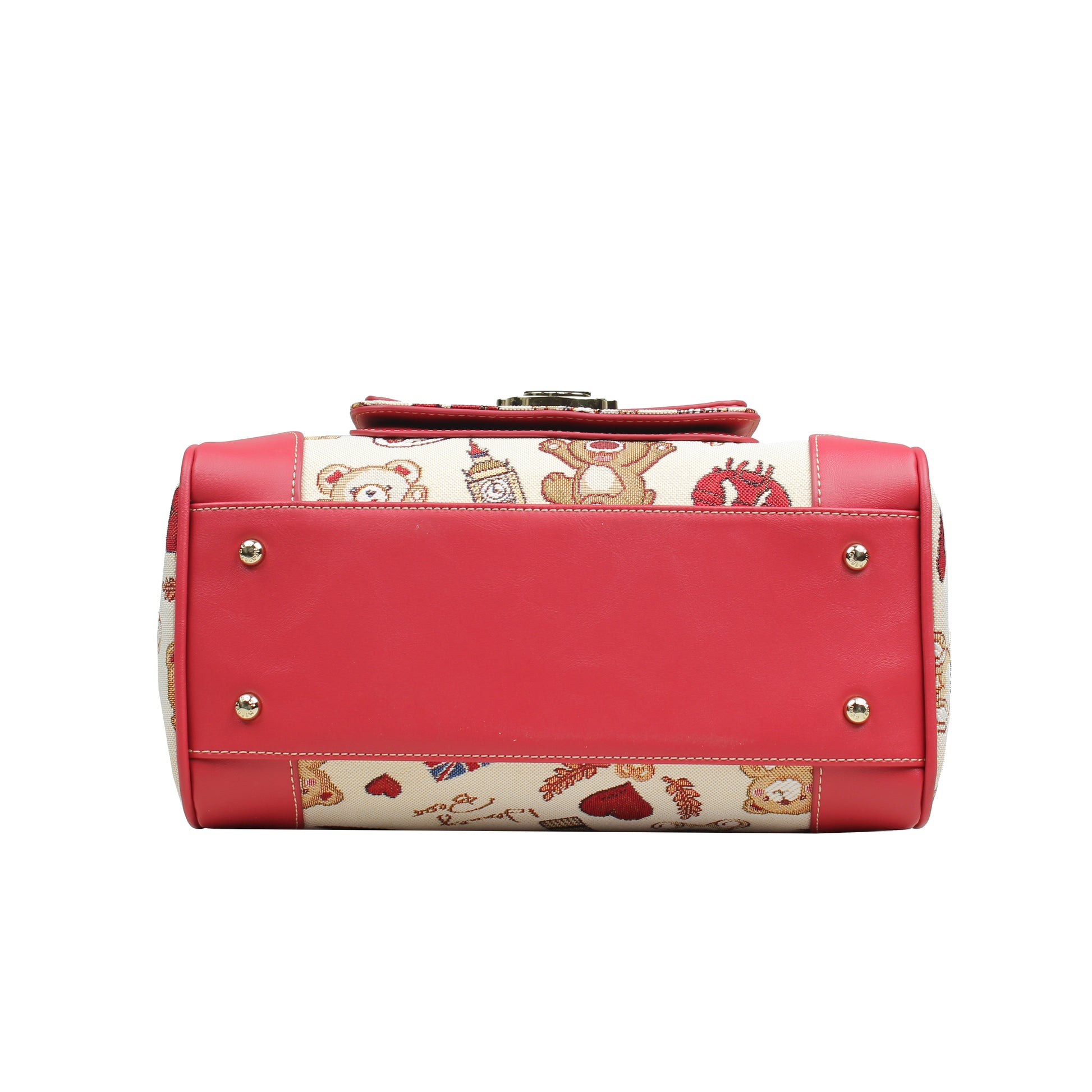 Charming and versatile, the Henney Bear Siena Top Handle Xbody Bag blends whimsical café-themed teddy bear prints with a structured silhouette for everyday flair. Designed with bold red PU accents and a secure flap closure, this bag easily transitions from crossbody wear to a stylish handbag with its dual carry options.