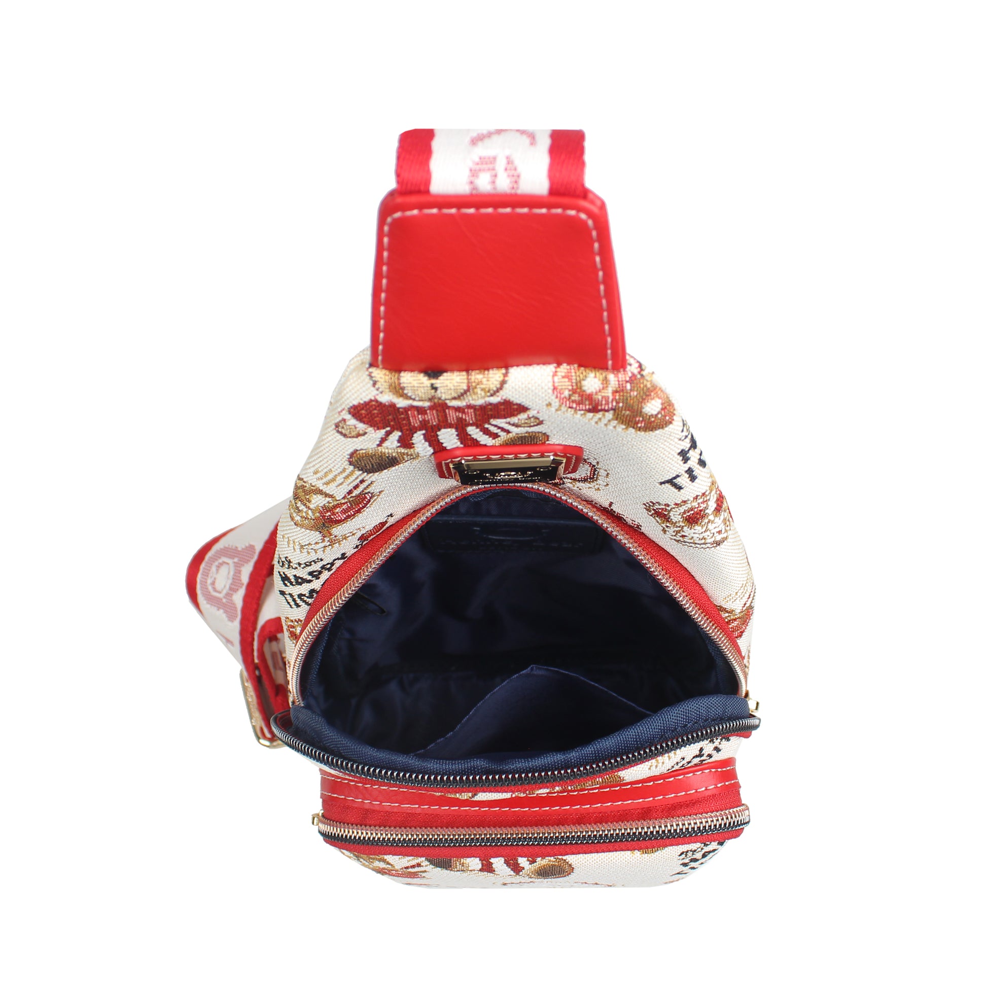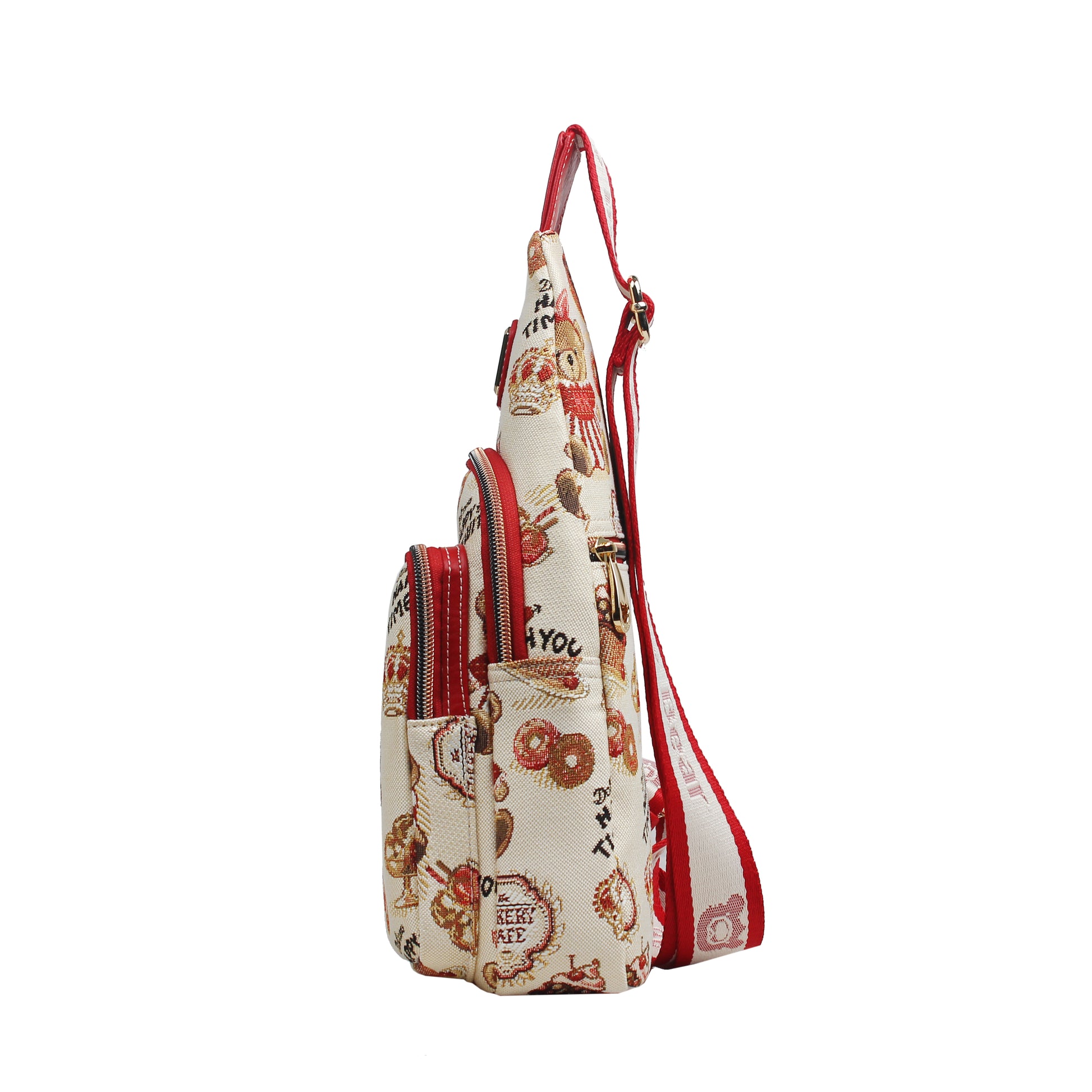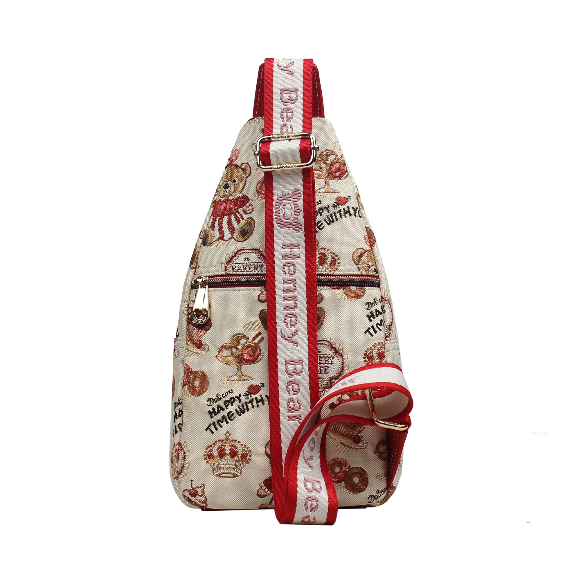 Chic and playful, the Stirling Body Bag is designed for the modern woman who loves style with a touch of fun. Crafted with premium tapestry fabric, it features whimsical teddy bear and dessert motifs, paired with vibrant red accents and gold-tone hardware for an elegant finish. Compact yet spacious, this bag keeps your essentials organized while adding a charming statement to your outfit. Perfect for casual outings, day trips, or café hopping, it blends practicality with personality.